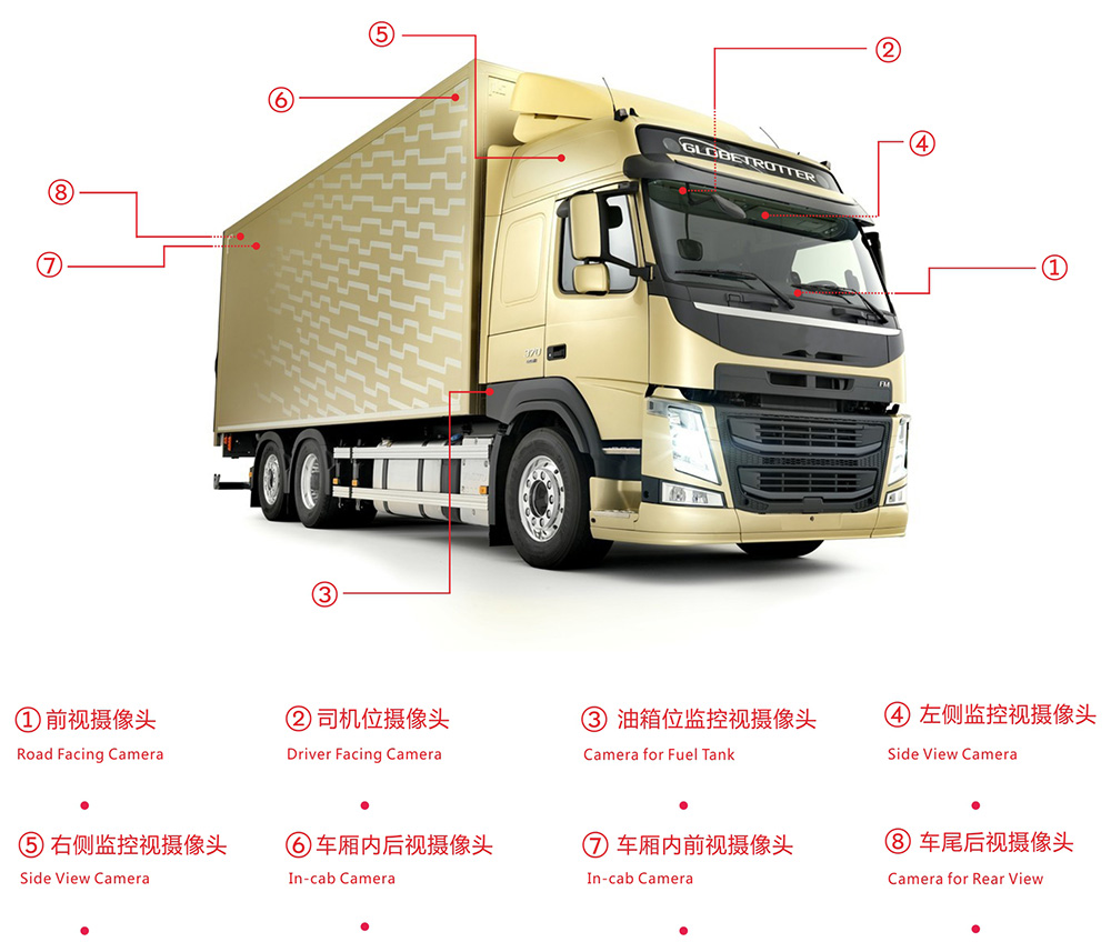 攝像頭安裝位置(根據車型大小可選多路車廂監控攝像頭):